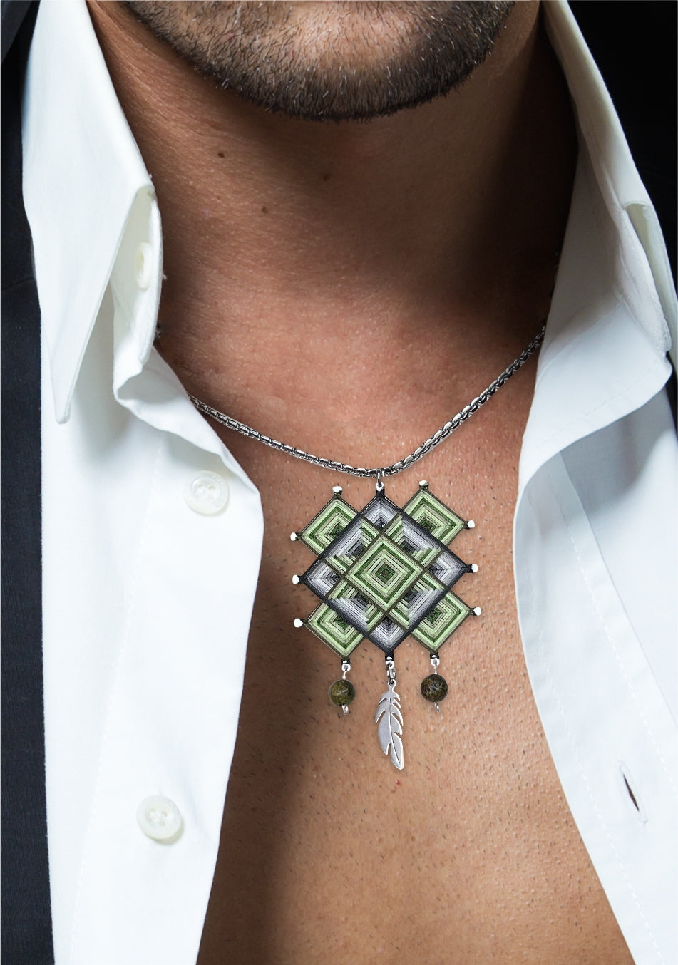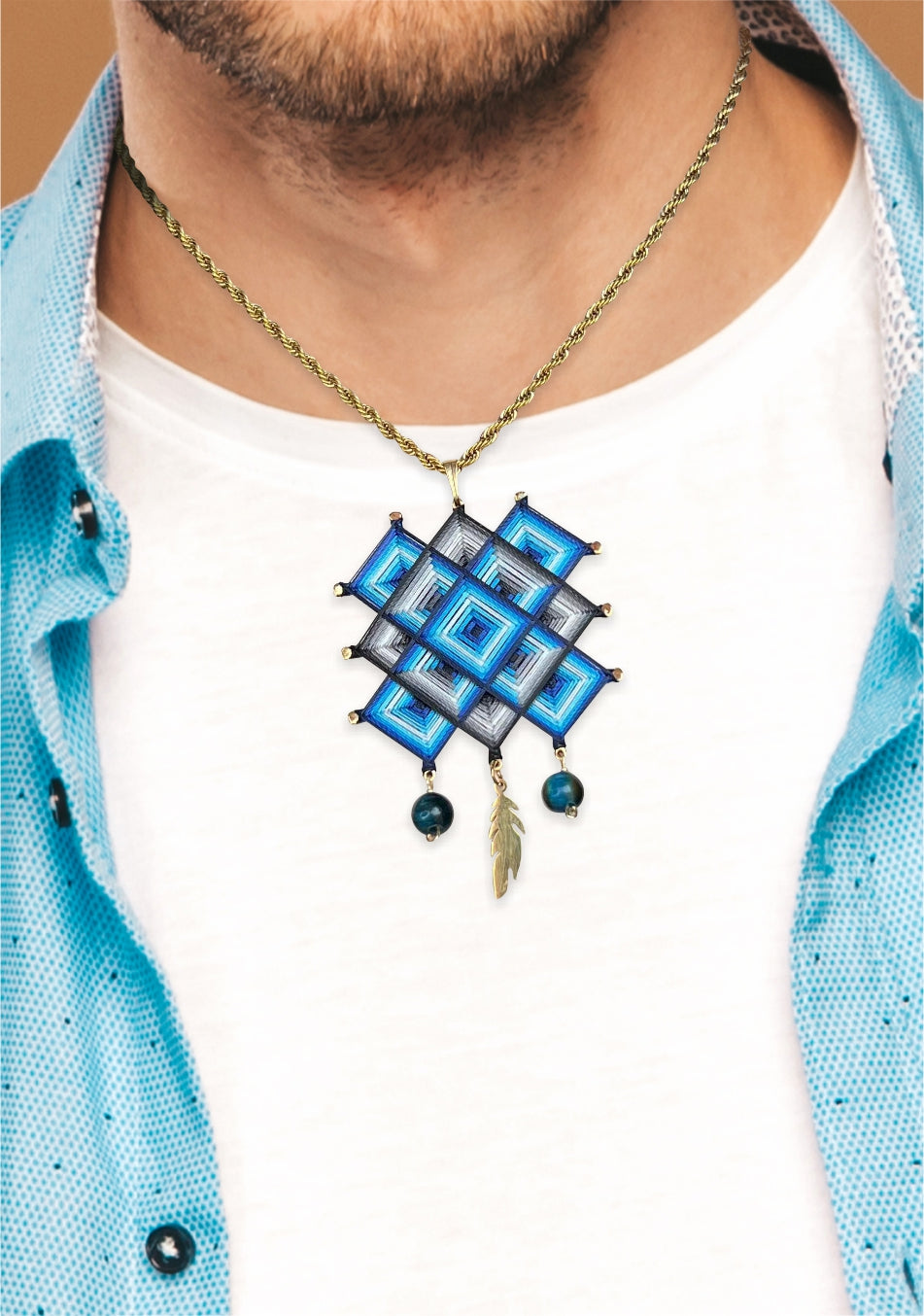 Collar con mandala tibetano tejido a mano sobre base metálica, decorado con piedras naturales.