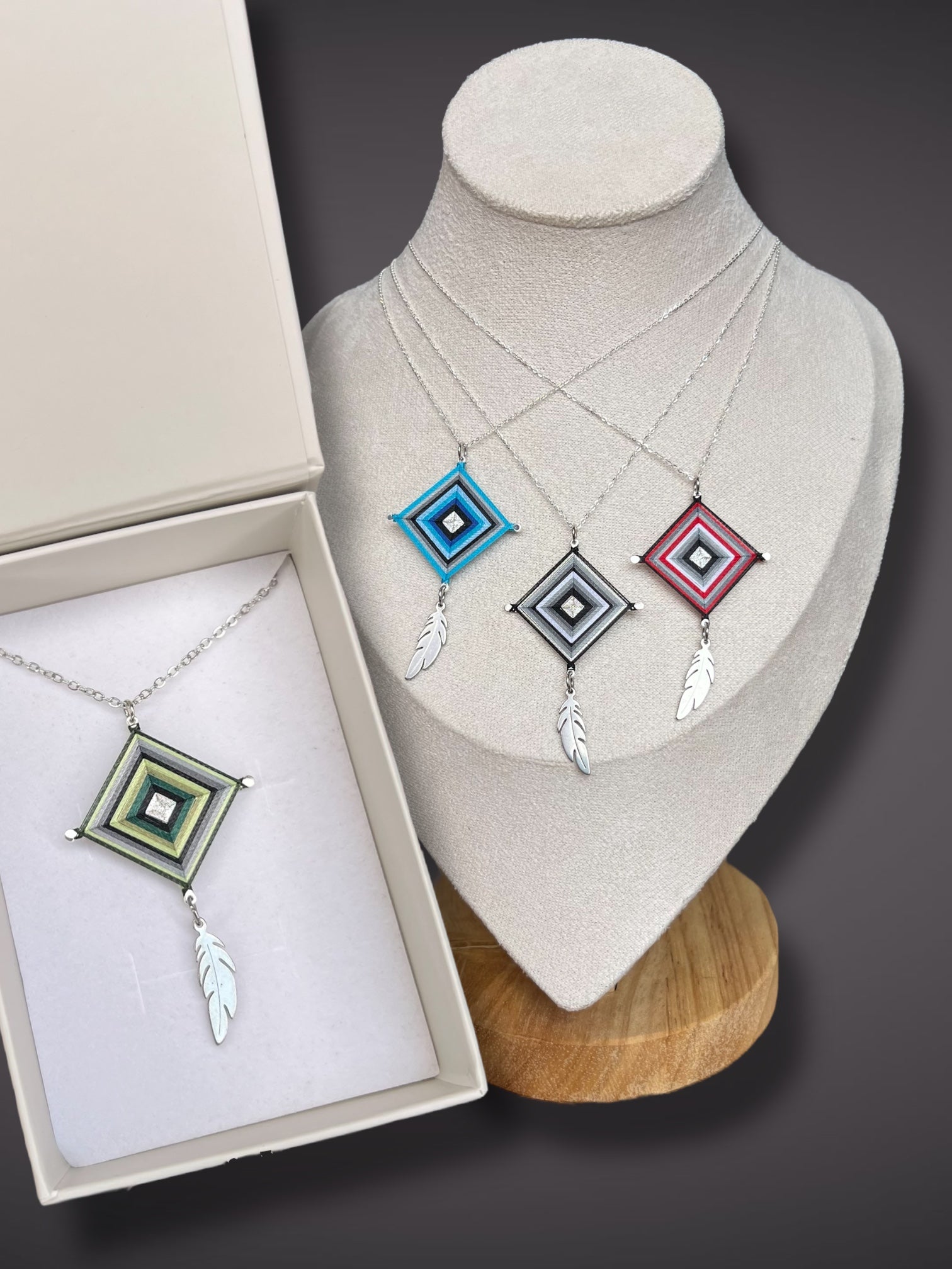 Collar tejido a mano con un diseño de rombos concéntricos, conocido como el Rombo Sagrado.