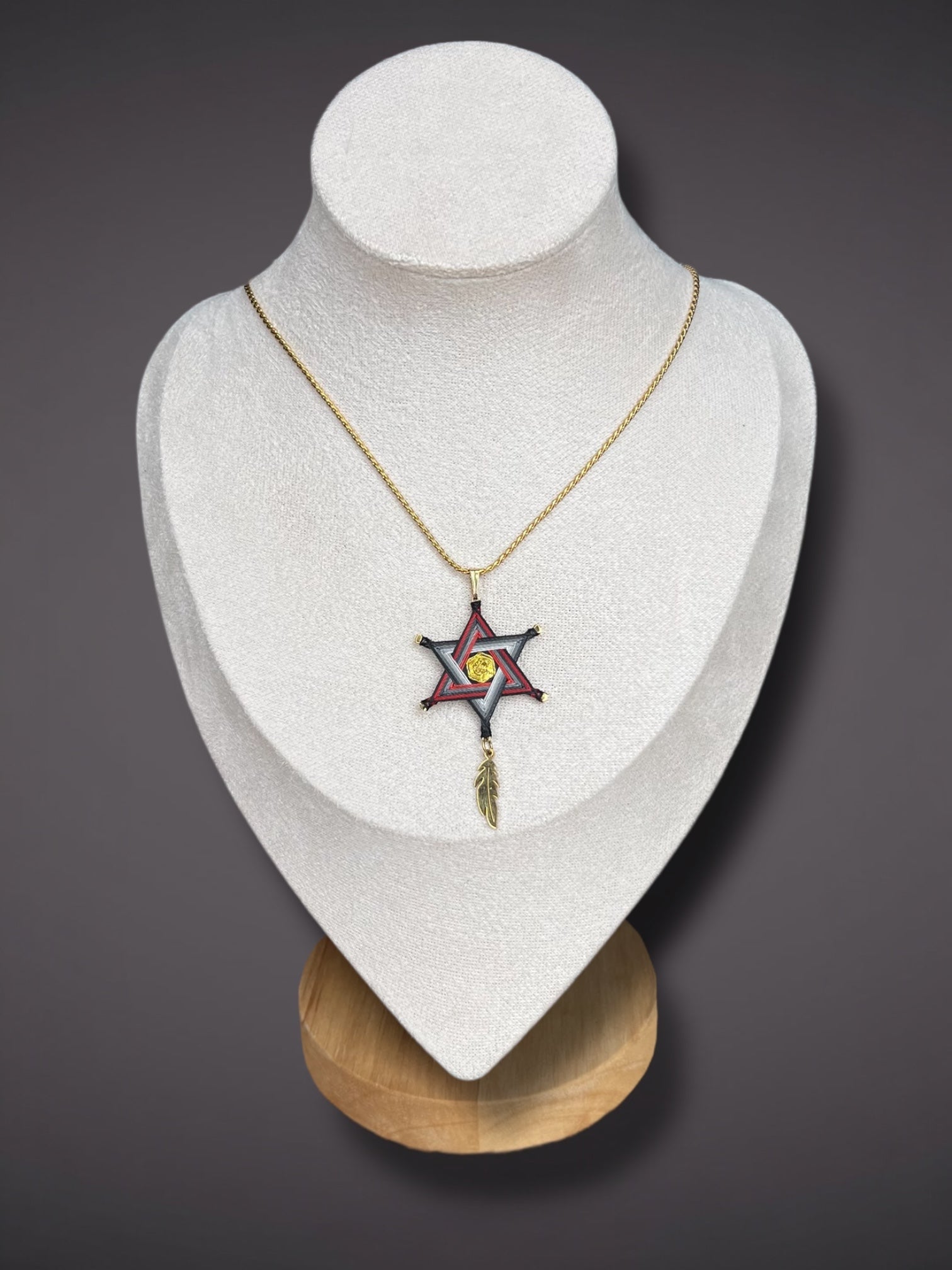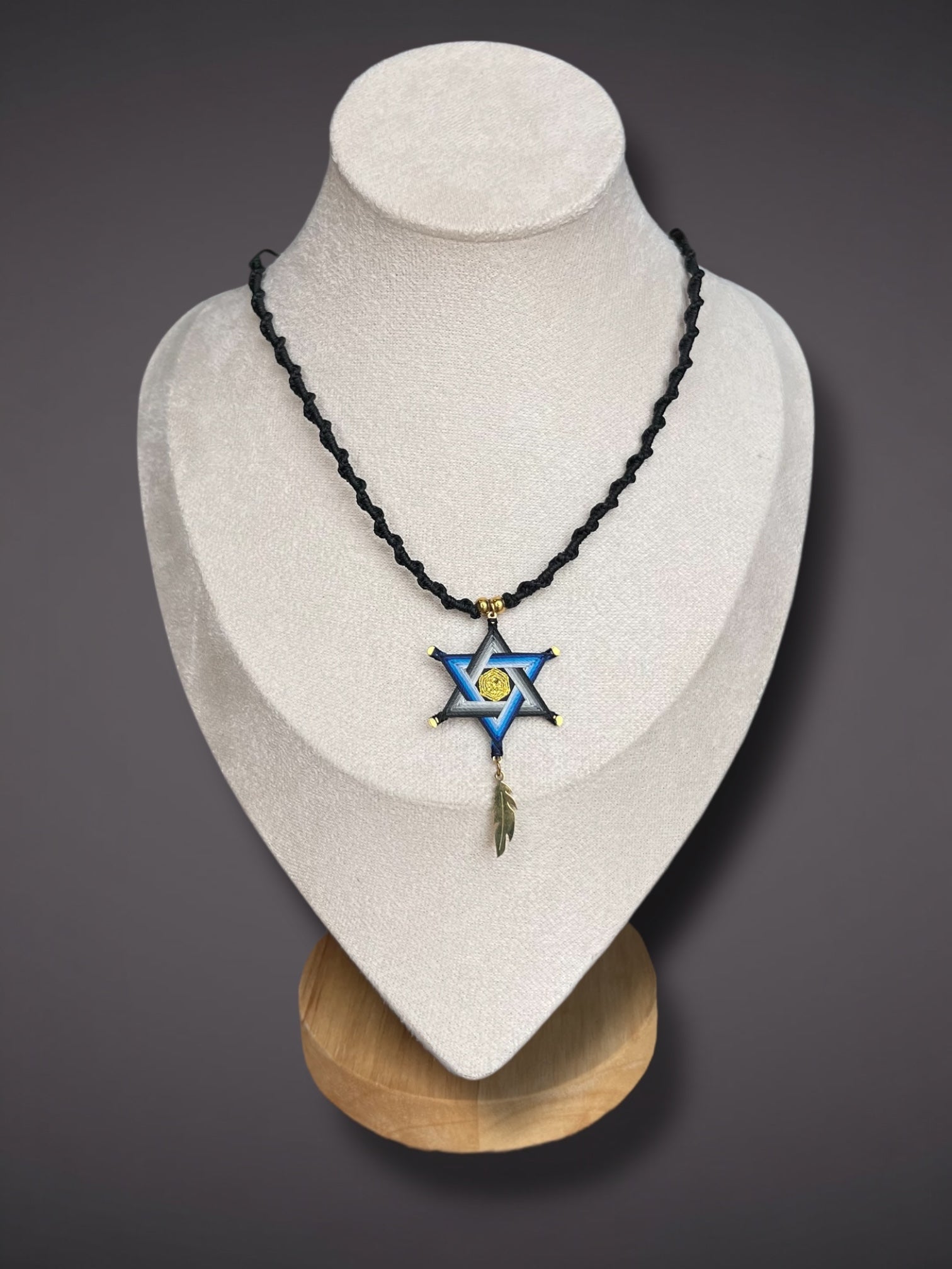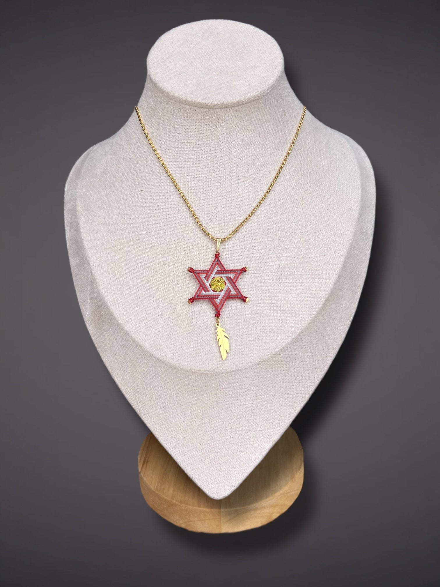 Collar tejido a mano con el símbolo de seis puntas entrelazadas, conocido como la Estrella Sagrada.