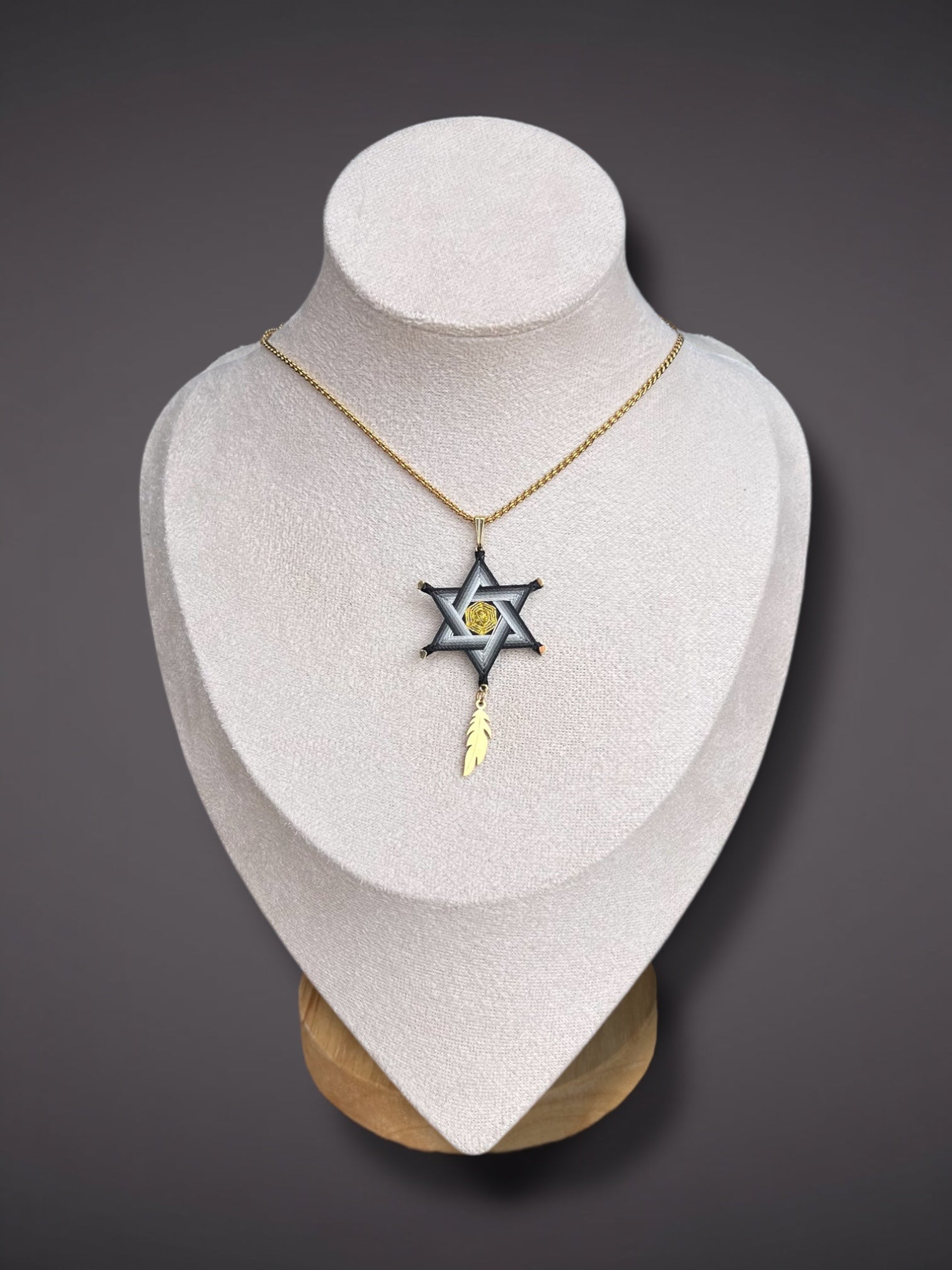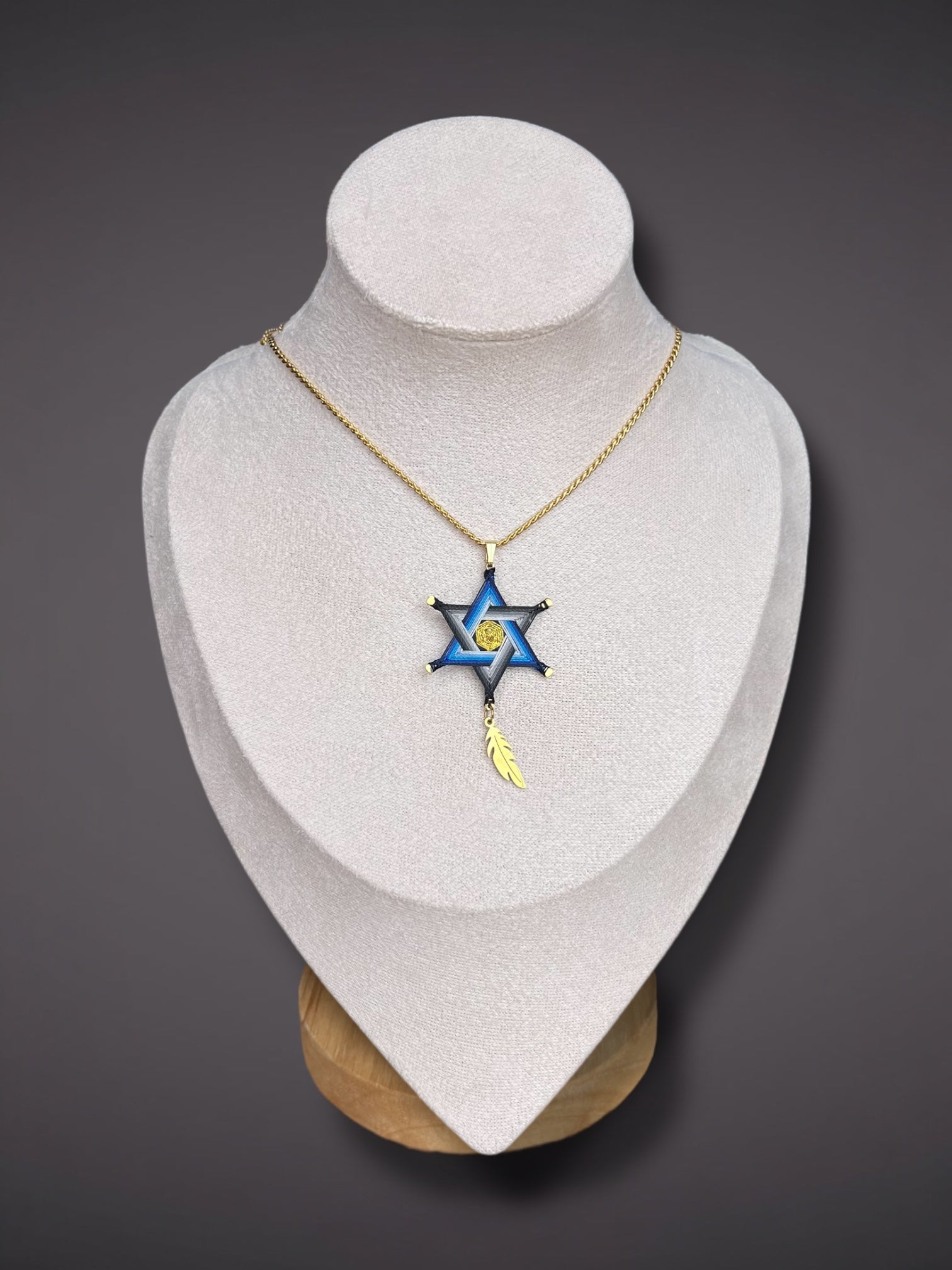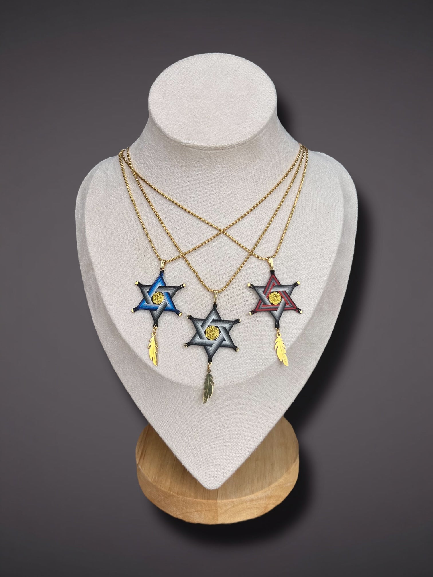 Collar tejido a mano con el símbolo de seis puntas entrelazadas, conocido como la Estrella Sagrada.