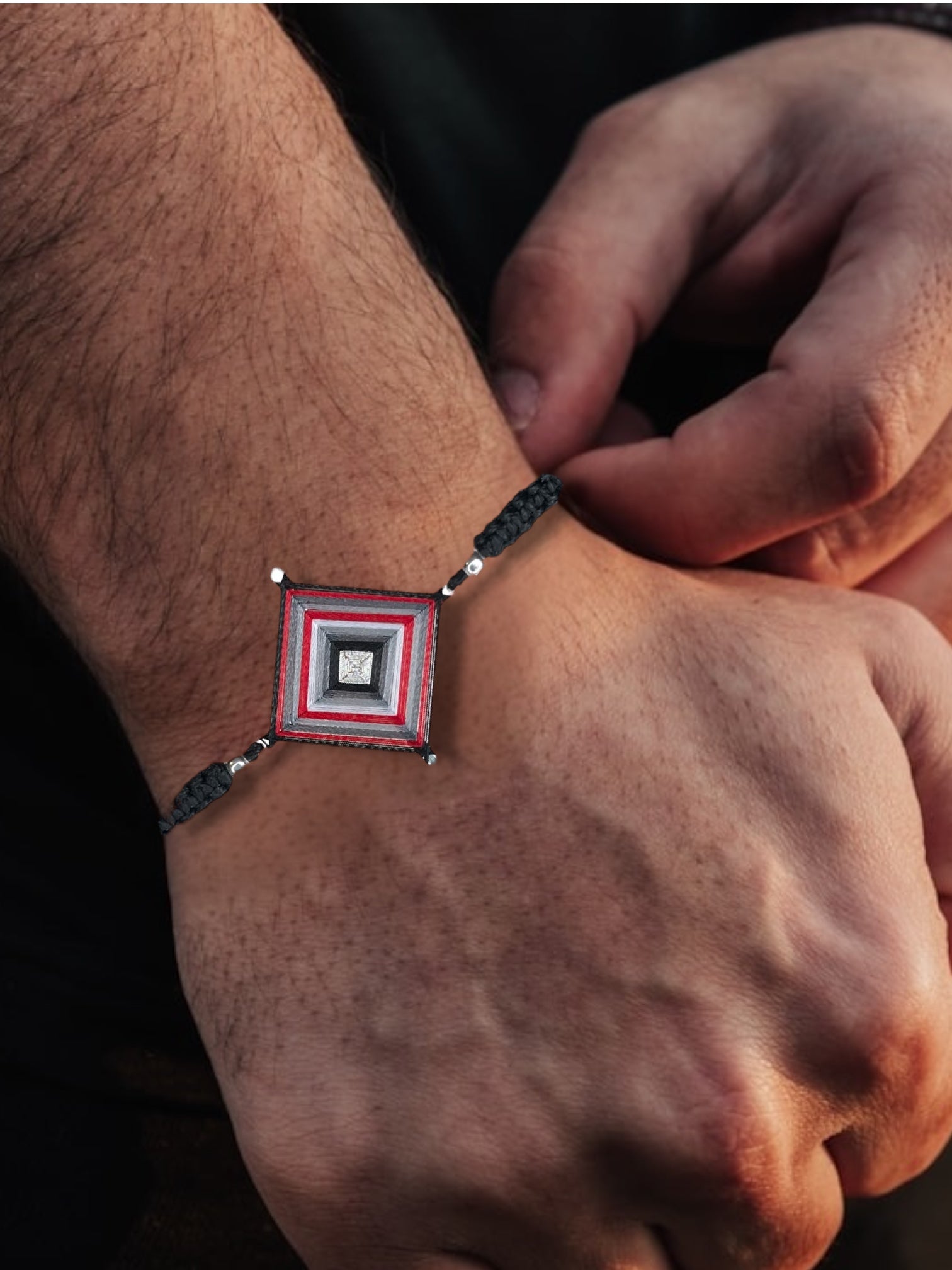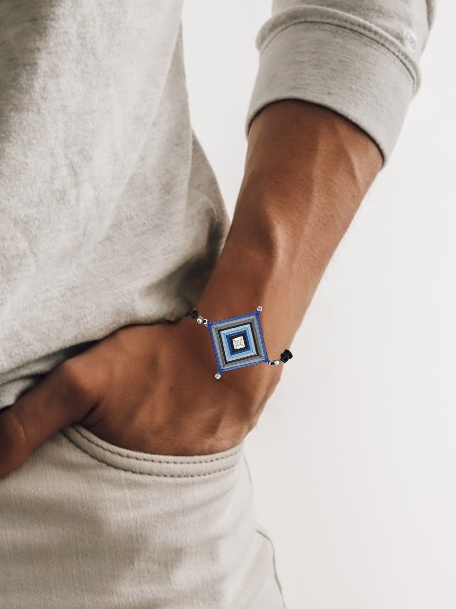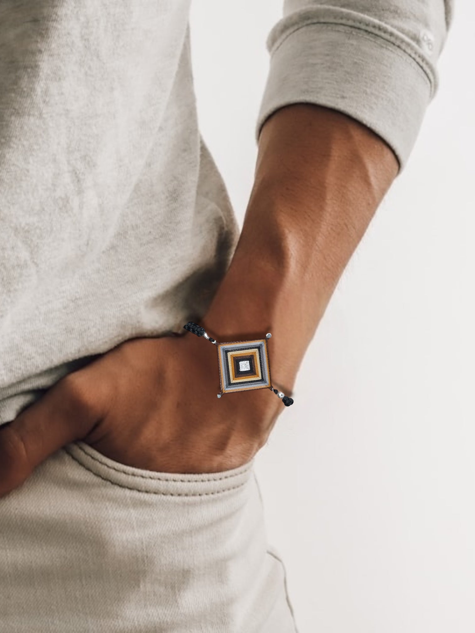 Pulsera tejida a mano con un diseño de rombos concéntricos, conocido como el Rombo Sagrado.