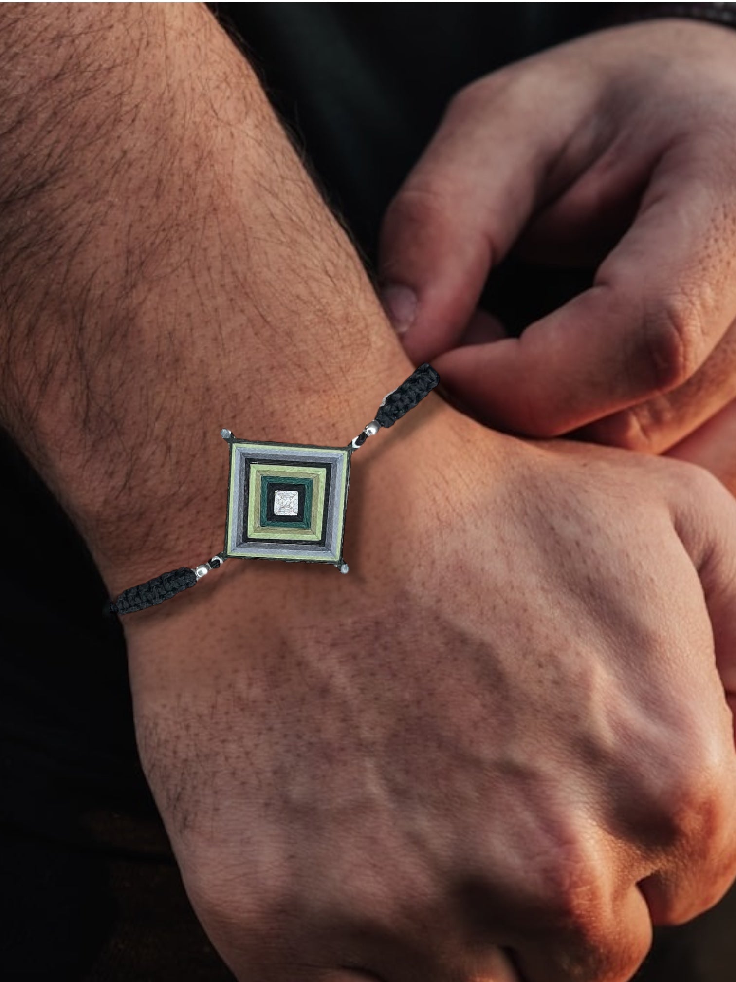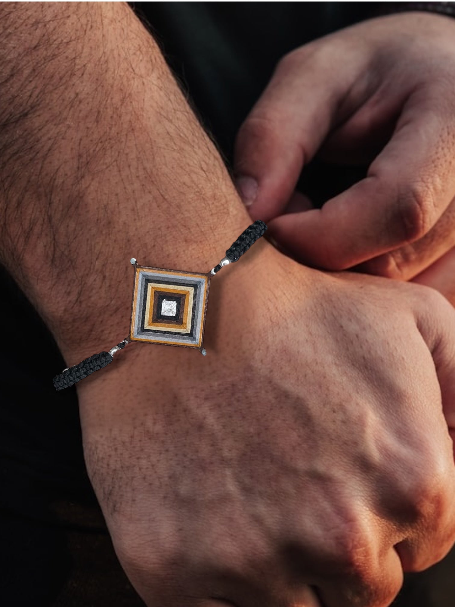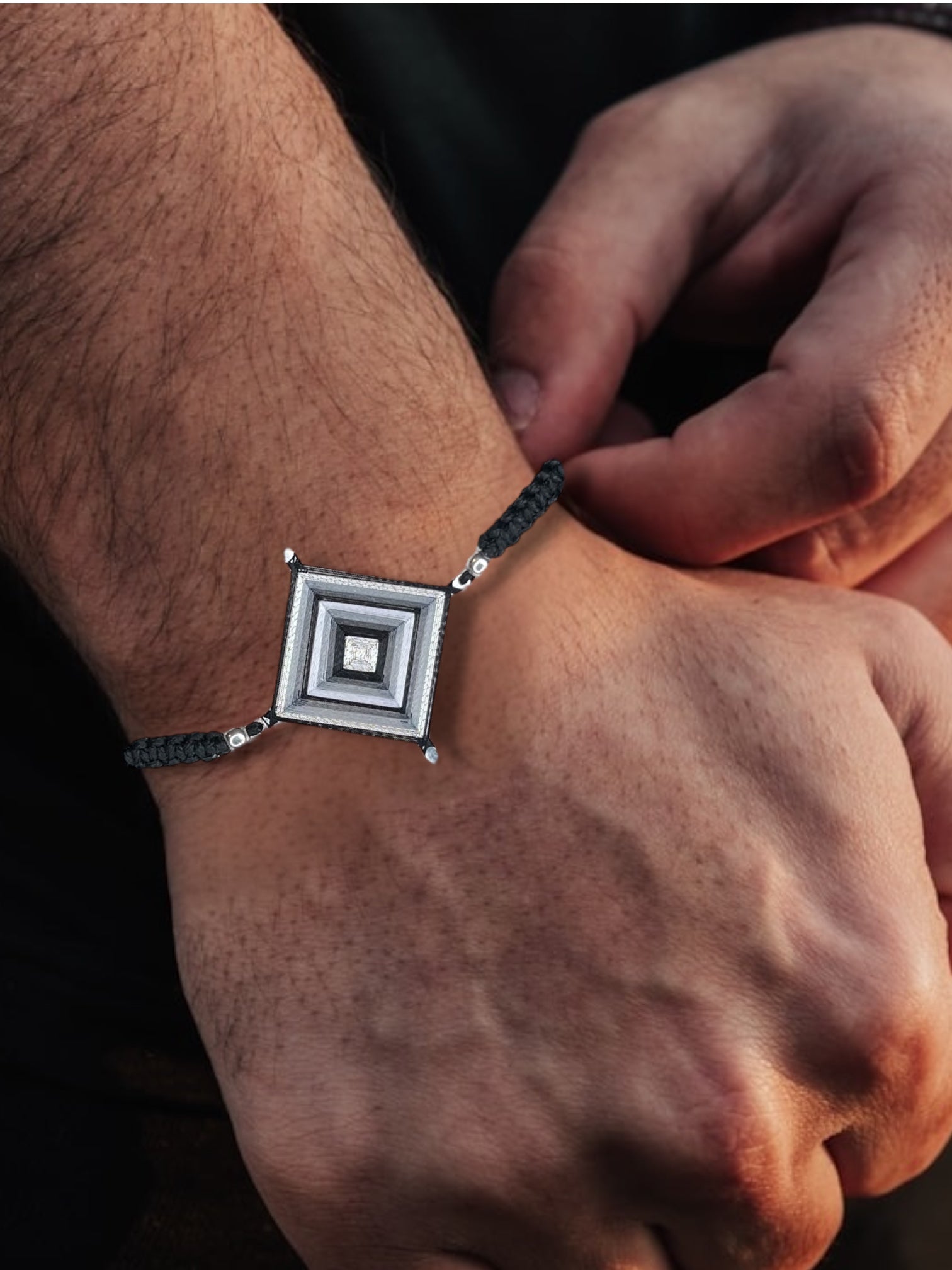 Pulsera tejida a mano con un diseño de rombos concéntricos, conocido como el Rombo Sagrado.